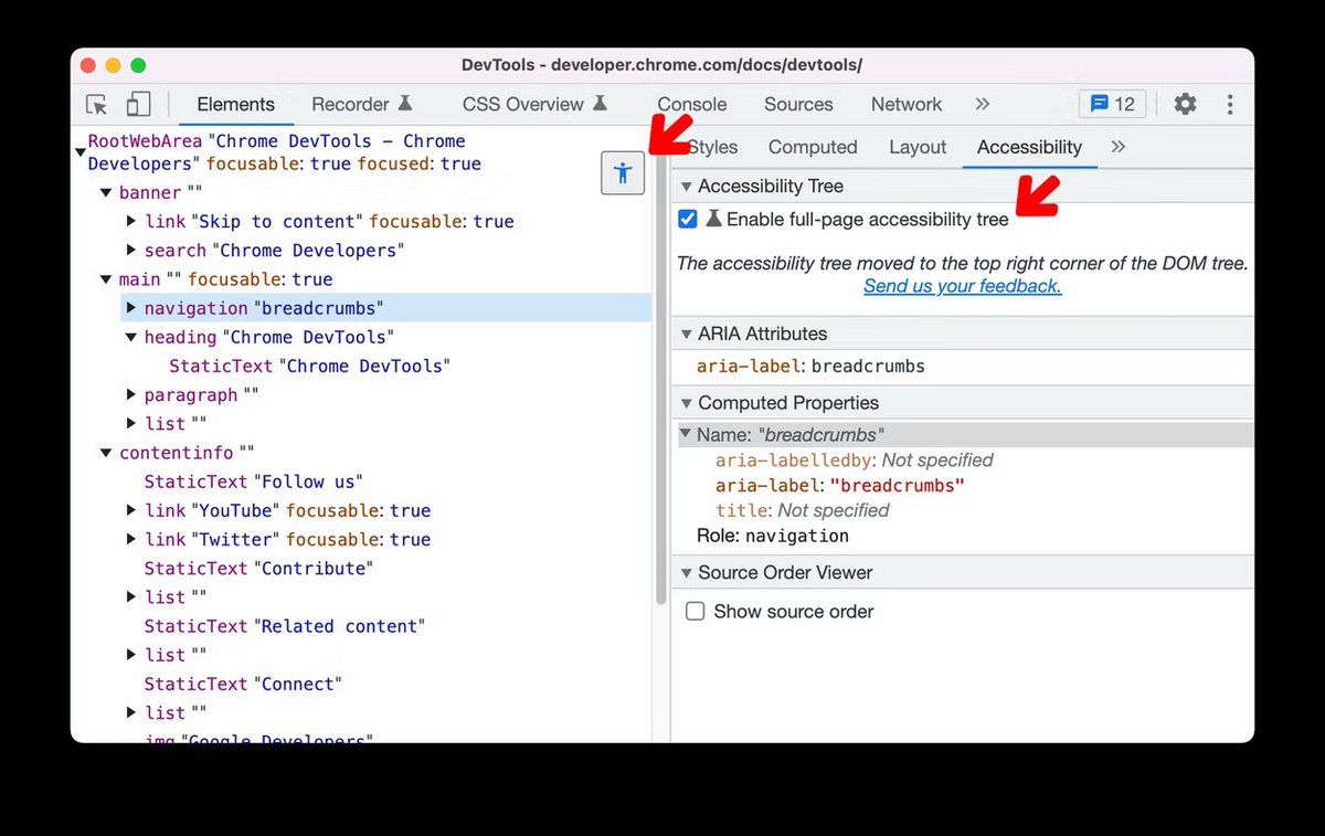 if you wanna learn about how to debug Accessibility issues using the Chrome Dev tools check out this Google I/O video by googleaccess to see the shiny new full-page Accessibility tree in action! io.google/2022/program/84bda4d4-bdd9-418f-aa85-f6adbc9f50d8/